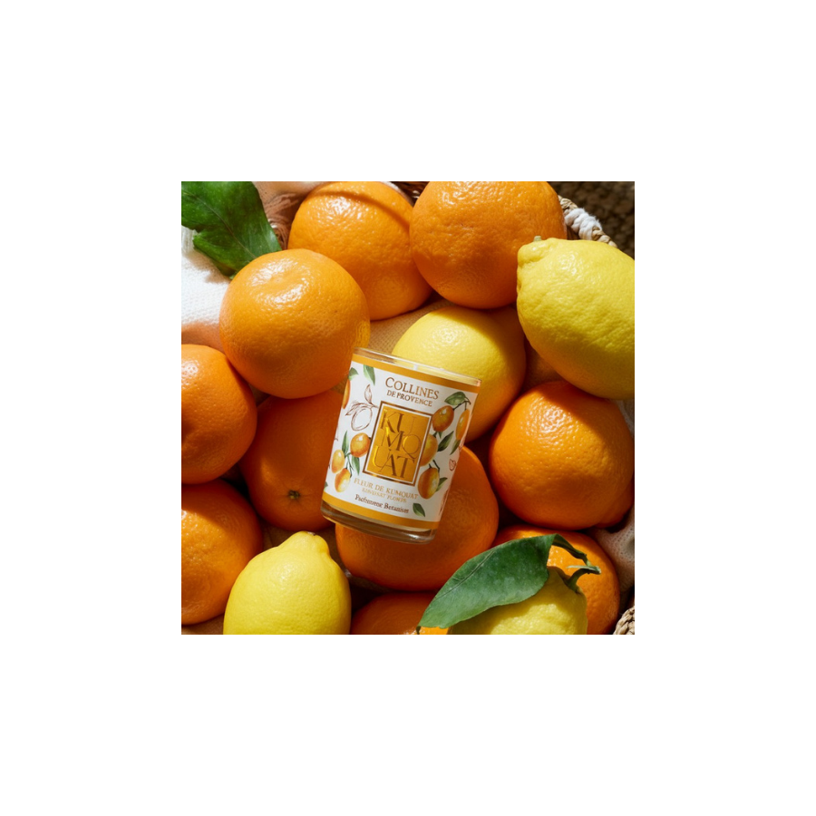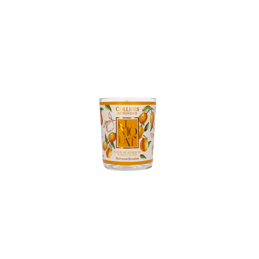 Bougie parfumée Fleur de Kumquat, une senteur fraîche et fruitée aux notes d’orange, mandarine et fleur de kumquat.