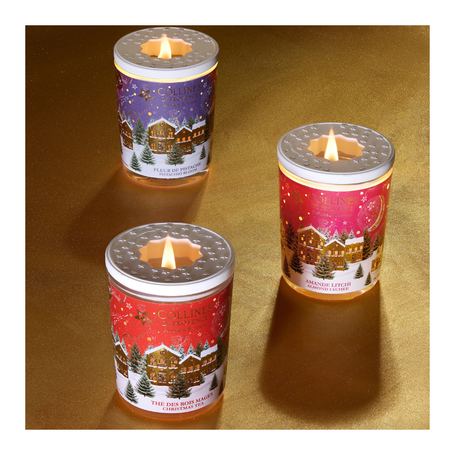 Plongez dans l’enchantement des fêtes avec la bougie parfumée Amande Litchi 180g, vêtue d’un décor rose framboise illuminé de fines dorures évoquant un ciel étoilé. Confectionnée à la main en Haute Provence, elle séduit par son capot en céramique raffiné, sa mèche bois crépitante et son étiquette ajourée laissant scintiller la flamme. Sa fragrance marie la douceur de l’amande à l’éclat fruité du litchi pour créer une ambiance raffinée et chaleureuse.