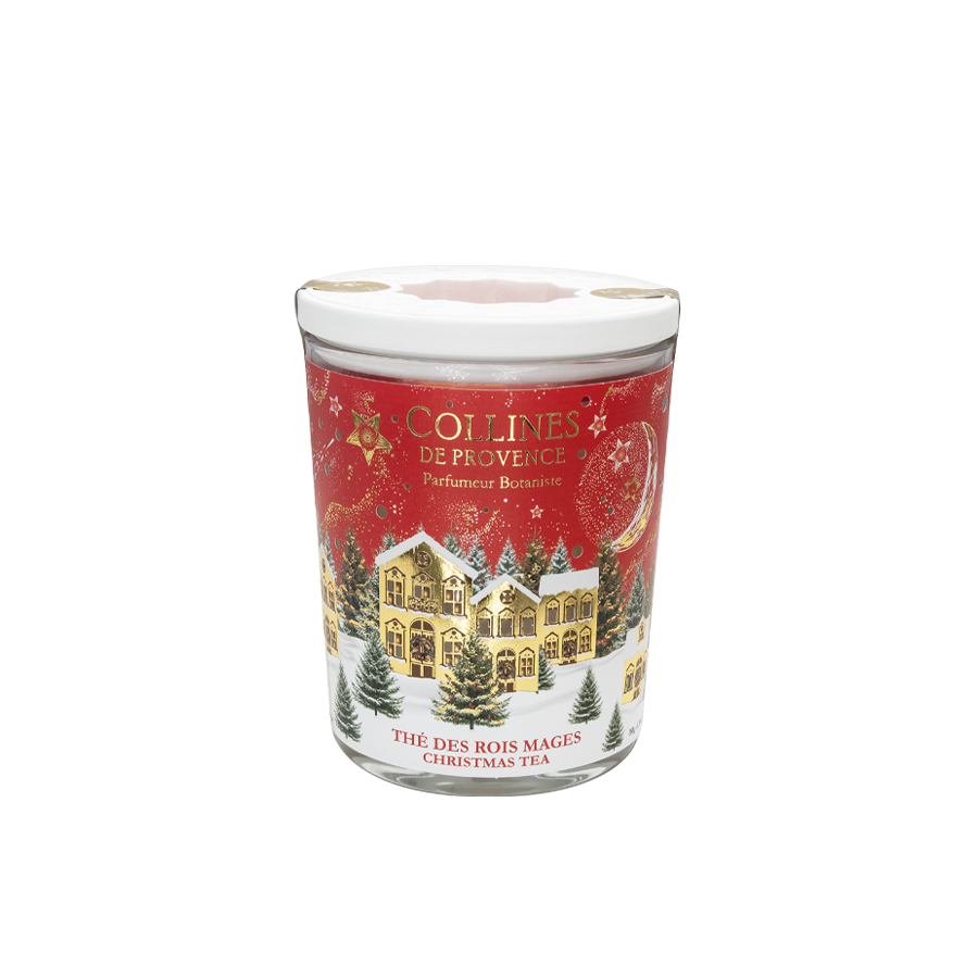 Découvrez la nouvelle bougie parfumée Noël Thé des Rois Mages coulée à la main dans nos ateliers en Haute Provence : Bougie coulée à la main Parfum de Grasse Une mèche bois qui crépite comme un feu de cheminée Capot céramique lampion Village de Noël scintillant