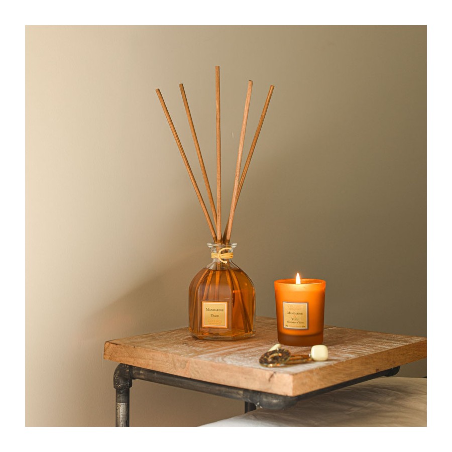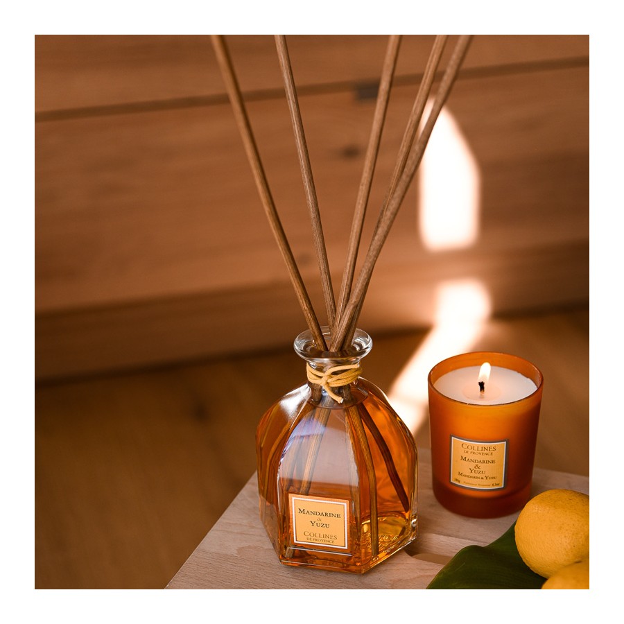 Découvrez le bouquet parfumé Mandarine & Yuzu Grand Format, découvrez notre senteur best-seller dans son flacon facetté exclusif Collines de Provence, sa couleur évocatrice du soleil de la Provence en fera un objet de décoration idéal pour votre intérieur. Ce format généreux permet de parfumer intensément les grand espaces pendant 4 à 5 mois.