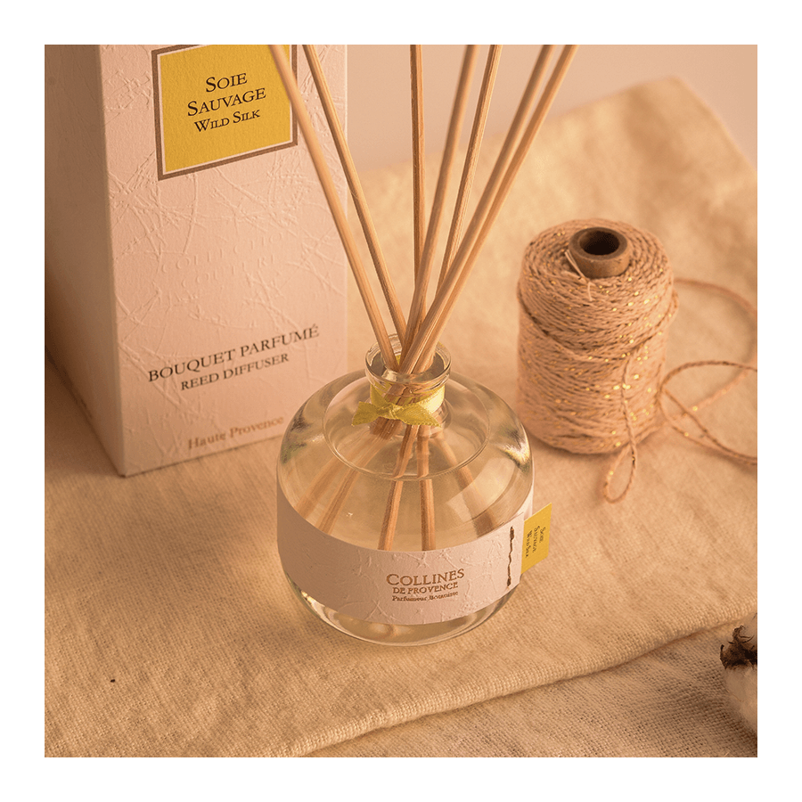 Découvrez la fragrance fleurie et musquée du bouquet parfumé Soie Sauvage Collines de Provence. Le bouquet parfumé est confectionné à la main dans nos à ateliers en Haute-Provence. Une senteur douce tel un voile de soie… Un cœur floral laissant place à un sillage vanillé et musqué.