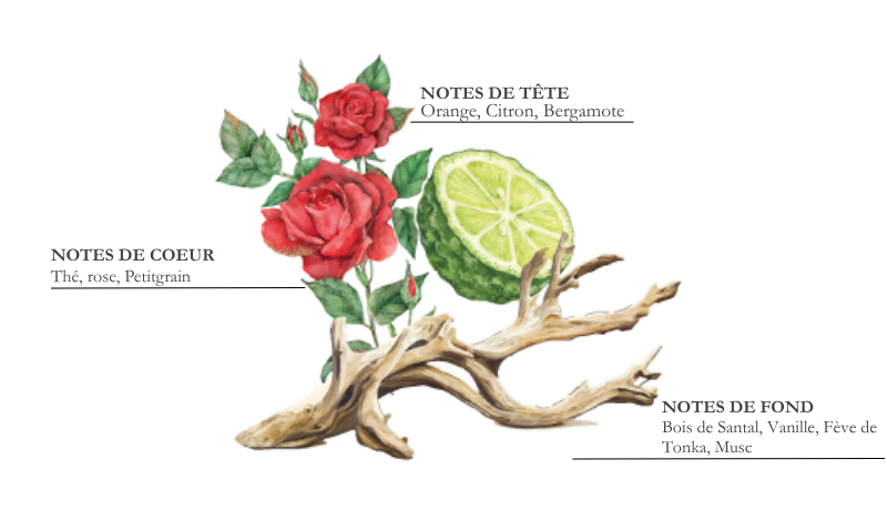 Note de Cœur : Thé, Rose, Prune, Petit-grain