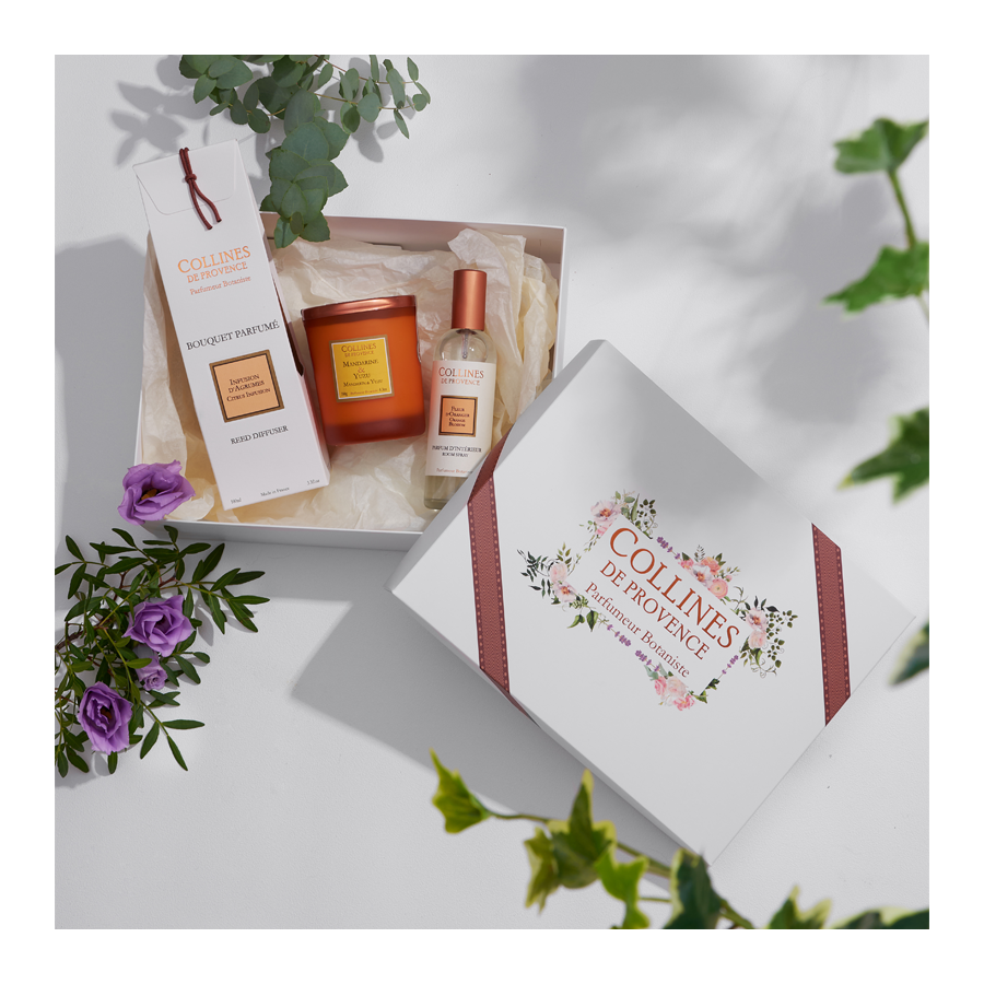 Découvrez notre coffret cadeau personnalisé, une véritable symphonie olfactive conçue pour émerveiller vos proches en toute occasion. À l'intérieur de cette élégante boîte cadeau se trouvent un bouquet parfumé, une bougie parfumée et un parfum d'intérieur, trois trésors parfumés qui éveilleront les sens et apporteront une touche de raffinement à n'importe quel espace.