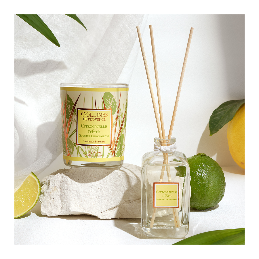 Entdecken Sie unsere neue Duftkerze ''Sommer-Zitronengras'' mit 100% pflanzlichem Wachs, die Zitrus- und blumige Noten aufweist.