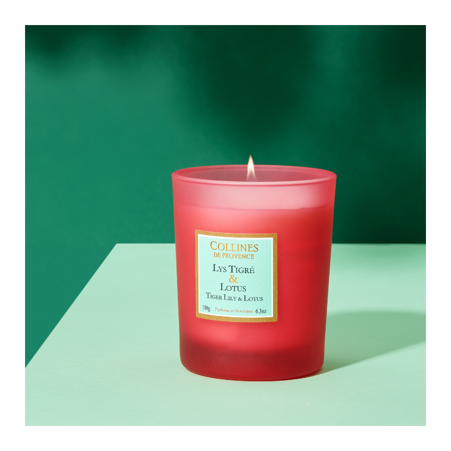 Entdecken Sie unsere Duftkerze Tigerlilie und Lotus mit blumigen und aquatischen Noten, handgefertigt in unseren Werkstätten in der Haute-Provence.