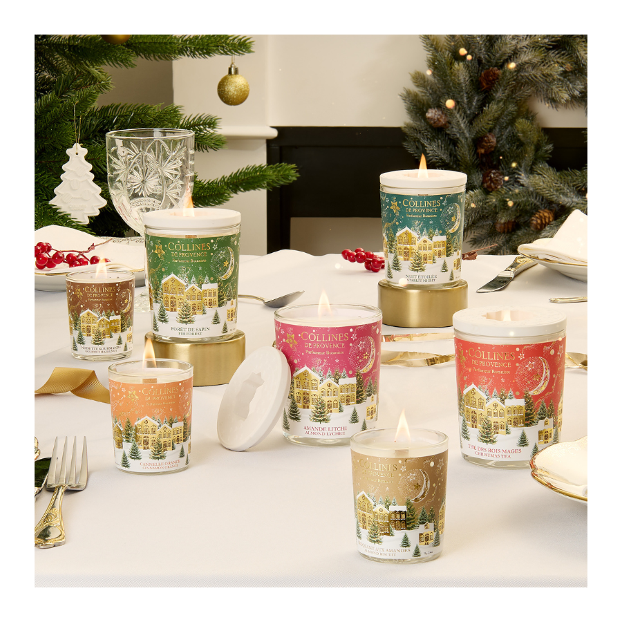 Handgegossen und mit einem Holzdocht ausgestattet, der knistert und den sanften Klang des Feuers evoziert, kommt sie in einer magischen Verpackung: Das sanfte Weihnachtslicht strahlt durch die Fenster des provenzalischen Dorfes...