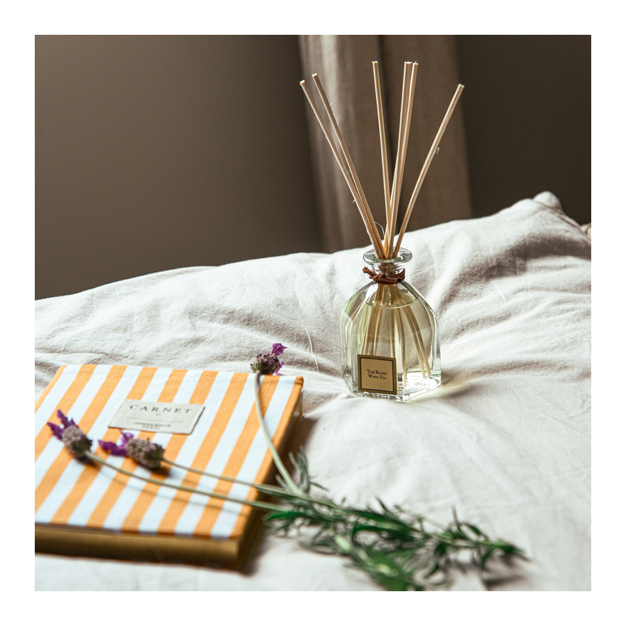 Ravie par le parfum de la bougie, j'ai fait l'acquisition du bouquet parfumé afin d'en profiter à tout moment. Malheureusement, le parfum du bouquet est bien plus subtil que celui de la bougie, il faut rester le nez collé dessus pour en profiter (et même là, l'odeur est moins réussie que pour la bougie, l'odeur de parfum/d'alcool se fait un peu trop sentir). J'avais auparavant fait l'acquisition du bouquet "Satin Rose" dont l'intensité correspondait bien mieux à mes attentes, le problème ne vient donc pas du format mais plutôt de la formule du parfum. Pour résumer, si vous avez été séduits par l'odeur de la bougie Thé Blanc, vous risquez d'être déçus par le bouquet parfumé.