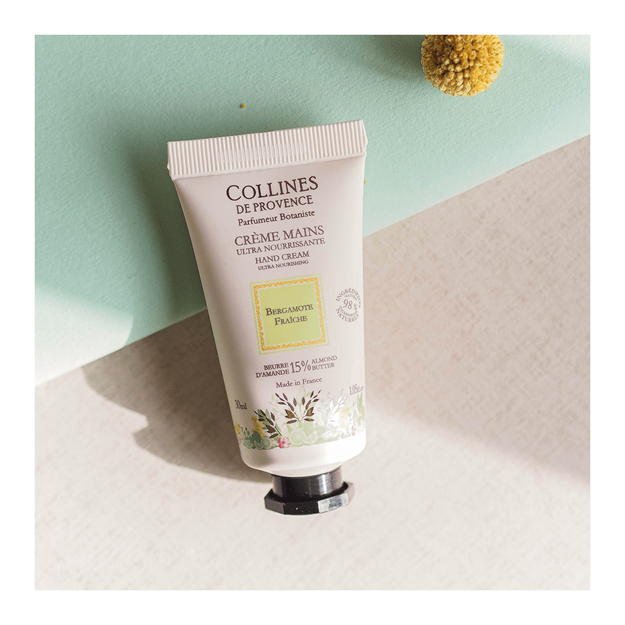 Die mit Mandelbutter aus der Provence (15 %) angereicherte Handcreme Frische Bergamotte von Collines de Provence zeichnet sich durch ihre cremige, zartschmelzende Textur aus und verfügt über die beruhigenden, reparierenden und nährenden Eigenschaften der Süßmandelbutter.
