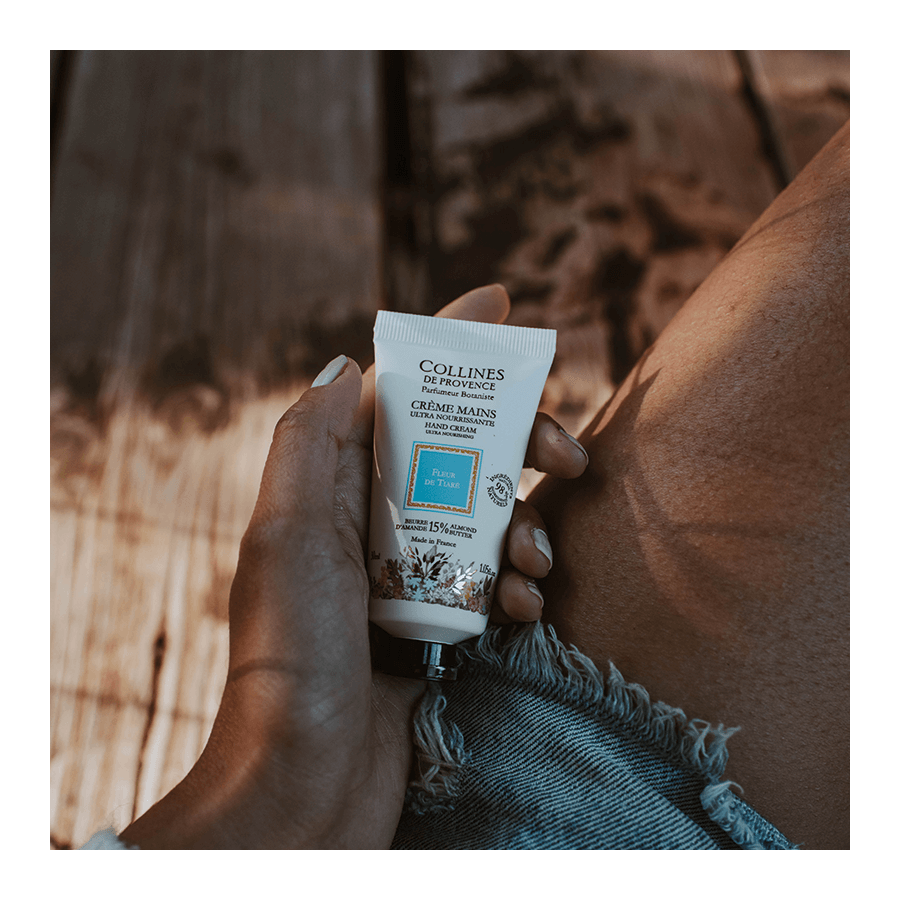Die mit Mandelbutter aus der Provence (15 %) angereichterte Handcreme Tahiti-Gardenie von Collines de Provence zeichnet sich durch ihre cremige, zartschmelzende Textur aus und verfügt über die beruhigenden Eigenschaften der Süßmandelbutter.