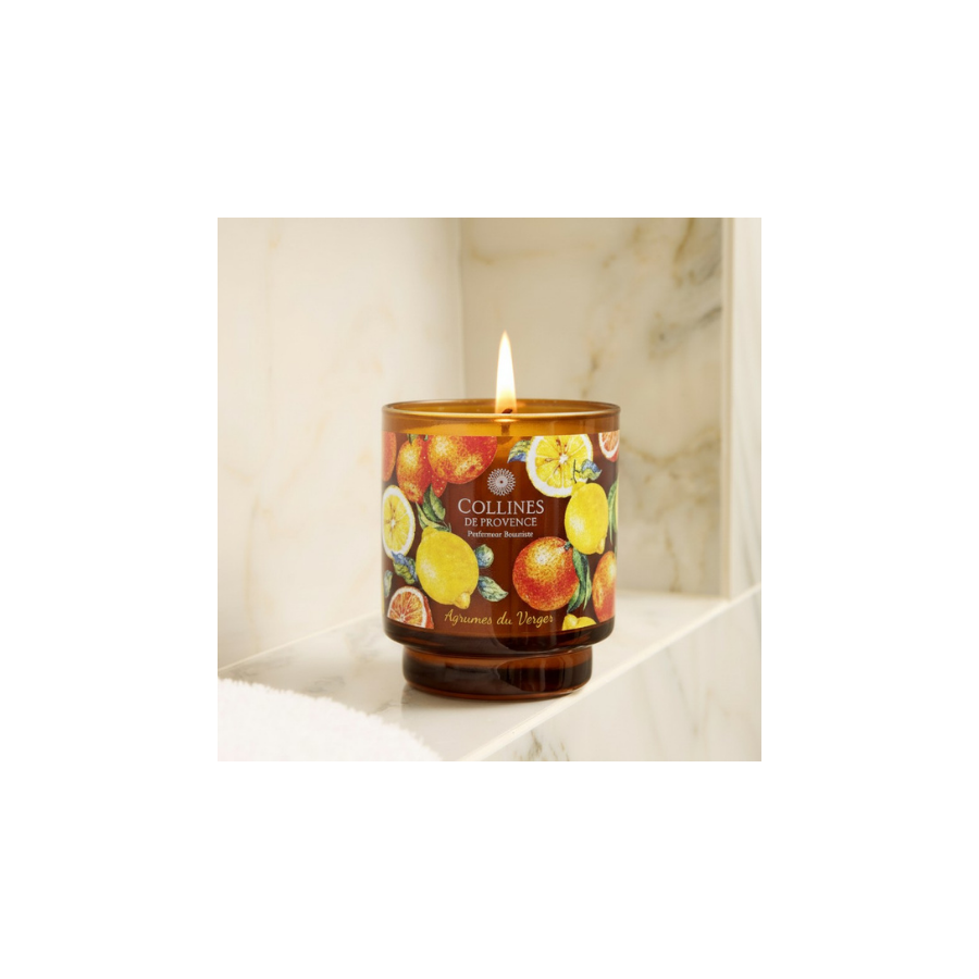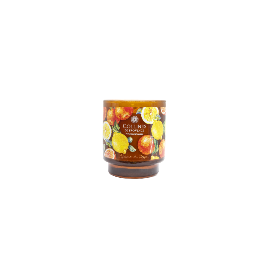 Entdecken Sie unsere Duftkerze Agrumes du Verger, eine handgefertigte Kreation mit floralen Noten, die in der Haute-Provence hergestellt wird. Genießen Sie den einzigartigen Photophore-Effekt dank ihres Lacks und des 100% natürlichen Wachses.