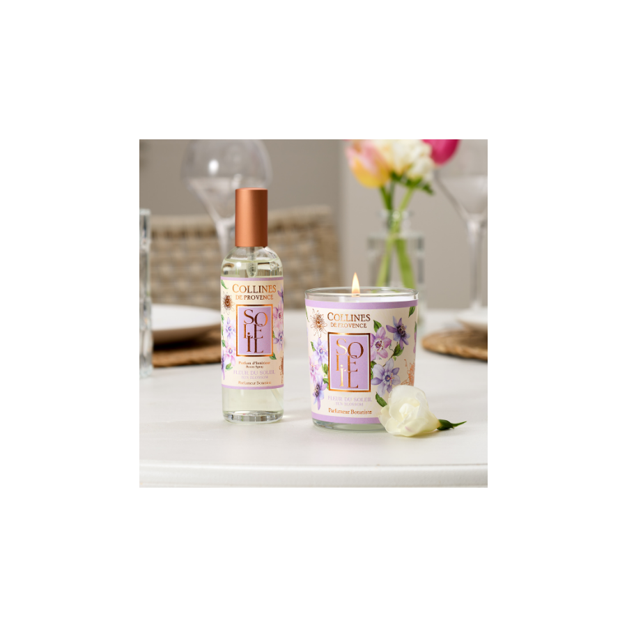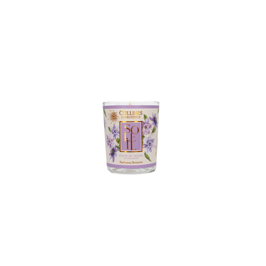 Parfümierte Kerze Sonnenblume, ein exotischer Blumenduft mit Noten von Mandarine, Feige und warmen Hölzern für eine sonnige Atmosphäre.