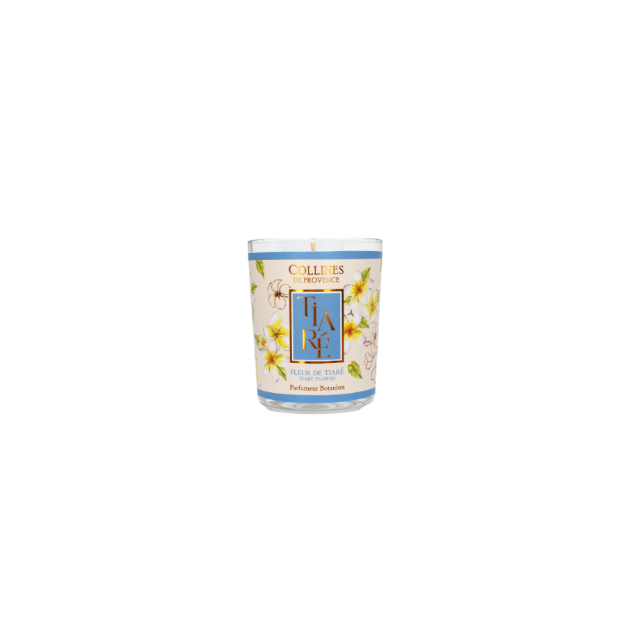Parfümierte Kerze Tahiti-Gardenie, ein sonniger Blumenduft mit Noten von Kokosnuss und weißen Blüten für eine warme Atmosphäre.