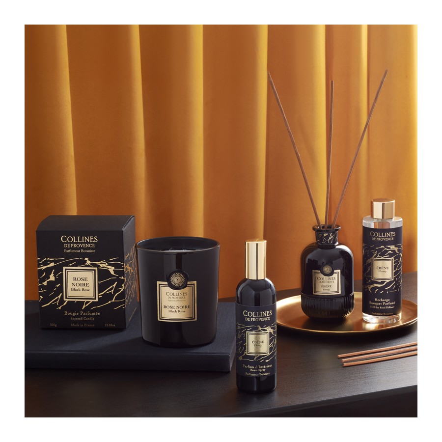 Entdecken Sie unseren "Ebène" Raumduft, der mit Sorgfalt in unserer Werkstatt in Mane, Haute-Provence, hergestellt wurde. Subtil komponiert aus holzigen und blumigen Noten, schafft dieses Parfüm eine warme und luxuriöse Atmosphäre