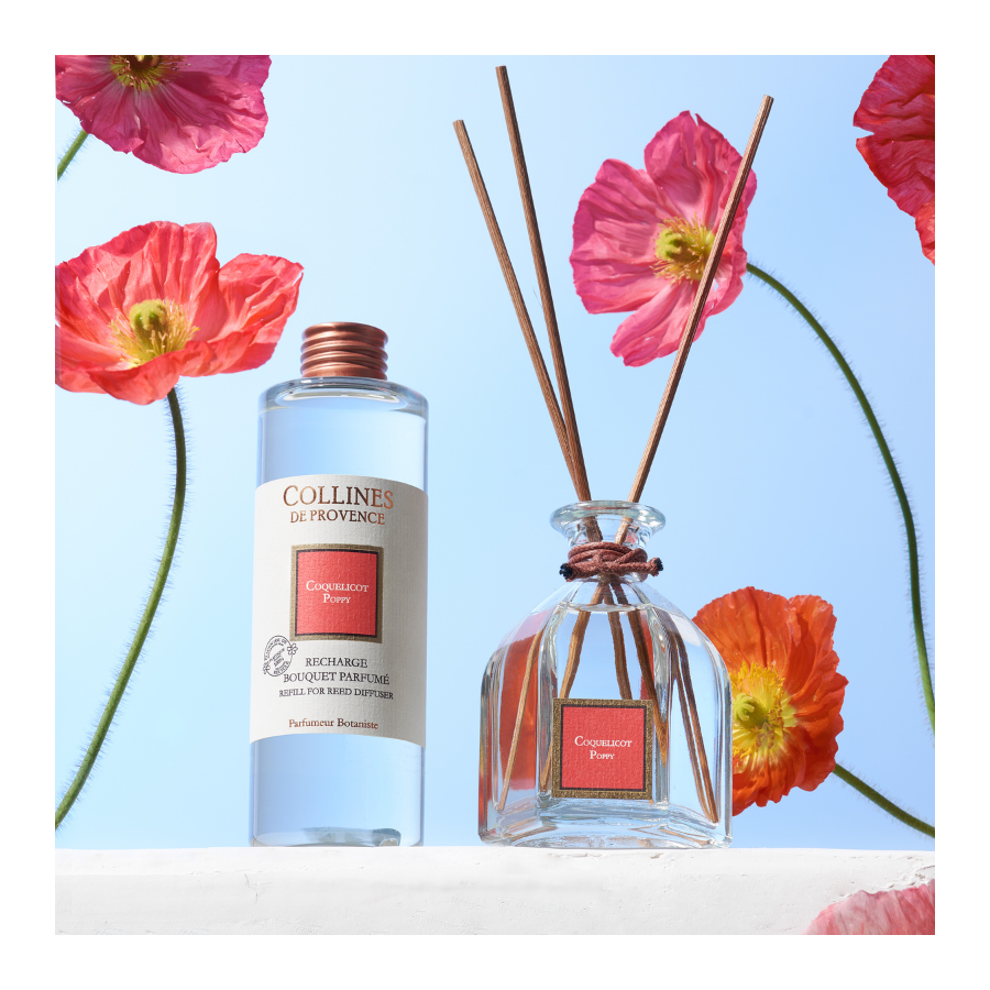 Découvrez notre recharge pour bouquet parfumé Coquelicot aux notes fleuries, fabriquée à la main dans nos ateliers en Haute-Provence.