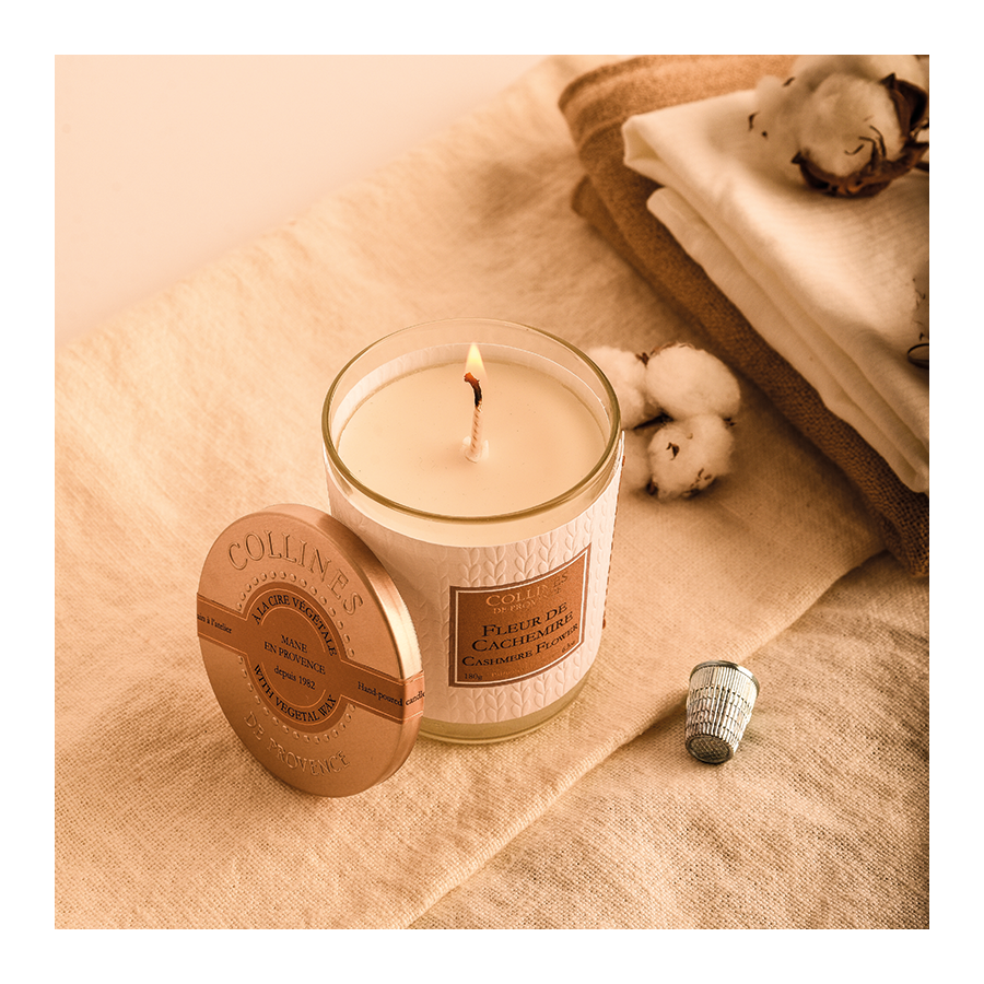 Experience the Cashmere Flower scented candle's floral and powdered notes, made in our Mane workshops in Haute-Provence. The scented candle's fragrance was created by our master perfumers in Grasse. This powdered blend wraps you in cashmere softness. A gentle fragrance blending the soothing scents of Violet, Iris and Rose.
