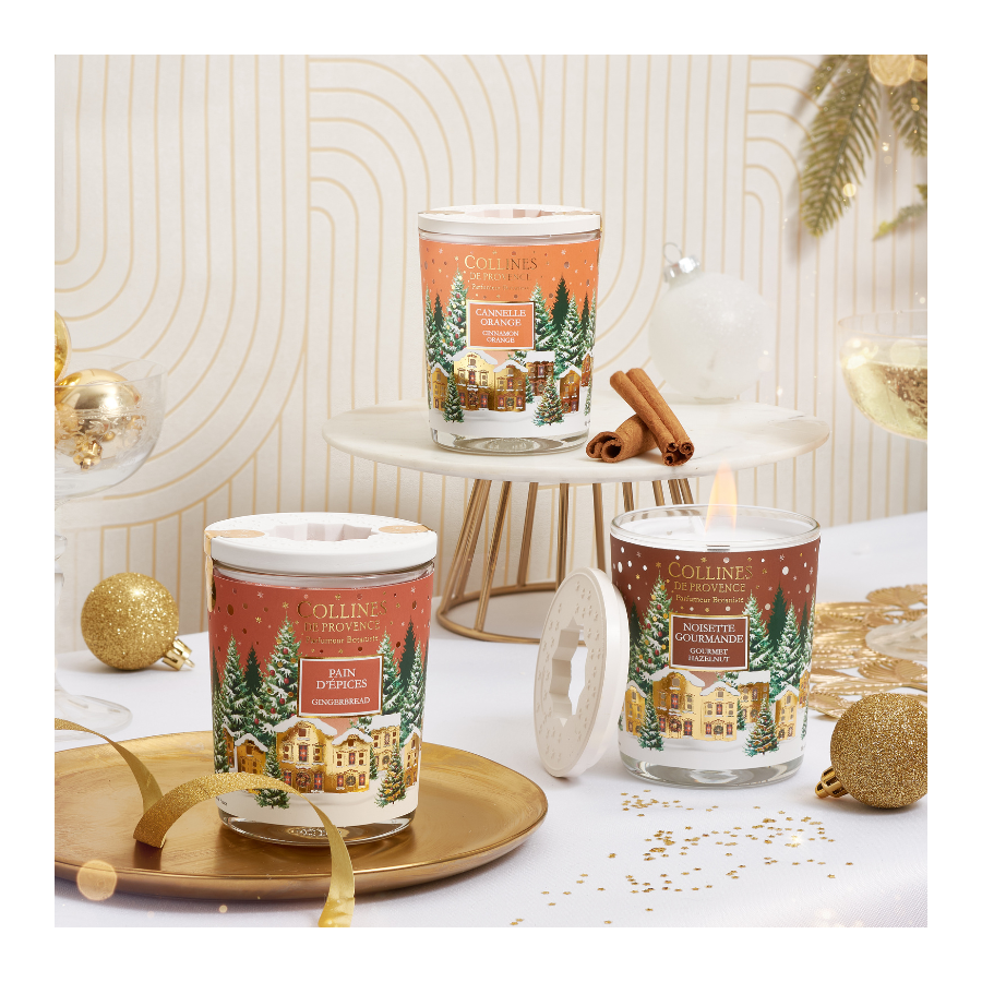 Discover the new Noël Noisette Gourmande scented candle, crafted in our Haute Provence workshops: Hand-poured candle Grasse fragrance Wooden wick that crackles like a fireplace Ceramic cap with lantern design Sparkling Christmas village