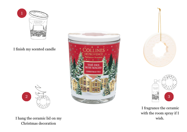 Discover the new Noël Thé des Rois Mages scented candle, hand-poured in our Haute-Provence workshops: Hand-poured candle Fragrance from Grasse Wooden wick that crackles like a fireplace Ceramic lantern lid Sparkling Christmas village