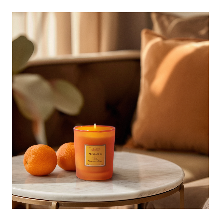 Collines de Provence's Mandarin & Yuzu scented candle is made from vegetable wax and natural ingredients. It stays true to Collines de Provence\'s signature style and elevates it with sun-drenched hues. Our fragrance expert from Grasse, the beating heart of perfumery, has designed a delicate fragrance to whisk you away on a voyage between Europe and Asia.