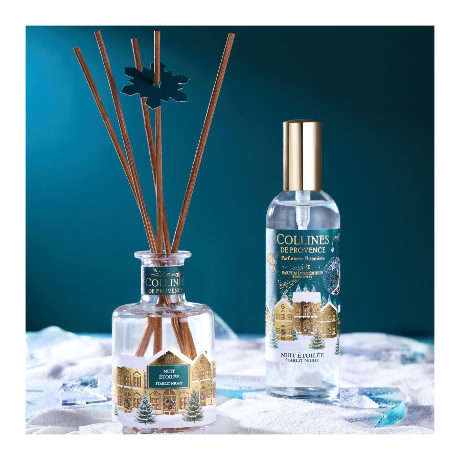 Elegant and festive, this home fragrance captivates with its modern blue design enhanced with hot foil stamping. Its playful packaging transforms into a little house that can be cut out and hung on the Christmas tree for an extra touch of magic. Inside, a delicate fragrance is revealed: soft and refined, it accompanies the festive season and prolongs its enchantment well beyond the festive moments.