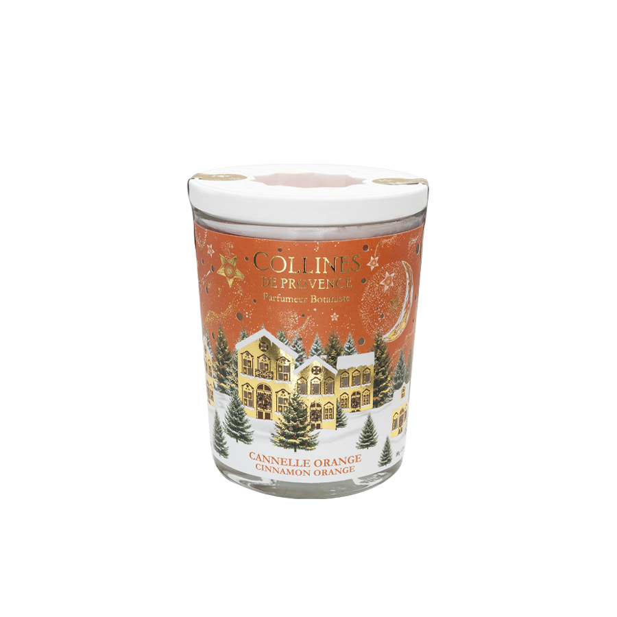 Treat yourself to the magic of Christmas with our 180g Cinnamon Orange scented candle, a warm blend of spicy cinnamon and sweet orange. Hand-poured in Haute Provence, this candle features a crackling wooden wick and a ceramic lid decorated with festive motifs, creating a cosy atmosphere with the sweet, spicy scent of Grasse.
