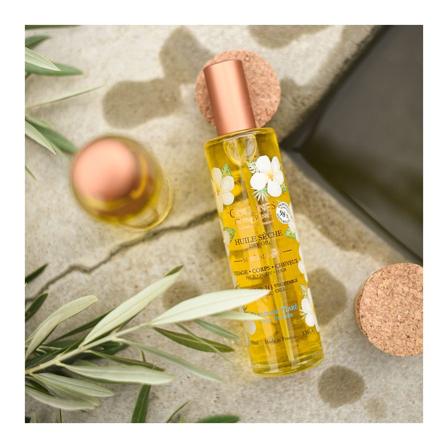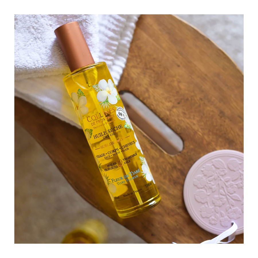 Discover the Tiare Flower Collines de Provence Dry Oil. This solar, suave and captivating scent invites you on a paradisiacal journey !