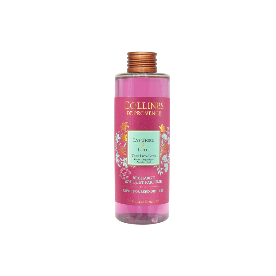 Discover our Lys Tigré & Lotus reed diffuser refill with floral and aquatic notes, handcrafted in our workshops in Haute-Provence.
